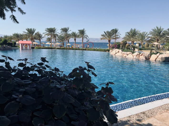 Die abgebildete Szene zeigt eine Person, die sich am Pool des Mövenpick Resort & Spa Tala Bay Aqaba in Jordanien entspannt. Das 5-Sterne-Resort liegt direkt am Roten Meer in einem exklusiven Wohngebiet, etwa 15 Minuten vom Stadtzentrum Akabas entfernt. Es verfügt über einen Privatstrand, einen Lagunen-Pool mit Wasserfällen und ein umfangreiches Spa- und Wellnesscenter. Gäste loben das hilfsbereite Personal und die Lage direkt am Meer. Alle Zimmer sind mit einem privaten Balkon und einer kostenfreien Minibar ausgestattet.