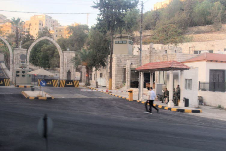 Tor zum Büro des Königs in Amman, Jordanien. Das arabische Wort „??“ („??“ bedeutet „Stopp“ oder „Halt“- sprich: qif) ist auf den gelben und schwarzen Barrieren zu sehen. Die Anlage befindet sich in Amman, Jordanien. Es handelt sich um den Eingang zu einem Regierungsgebäude, dem Büro des jordanischen Königs. Die Sicherheitsvorkehrungen umfassen Barrieren und eine Wachkabine.