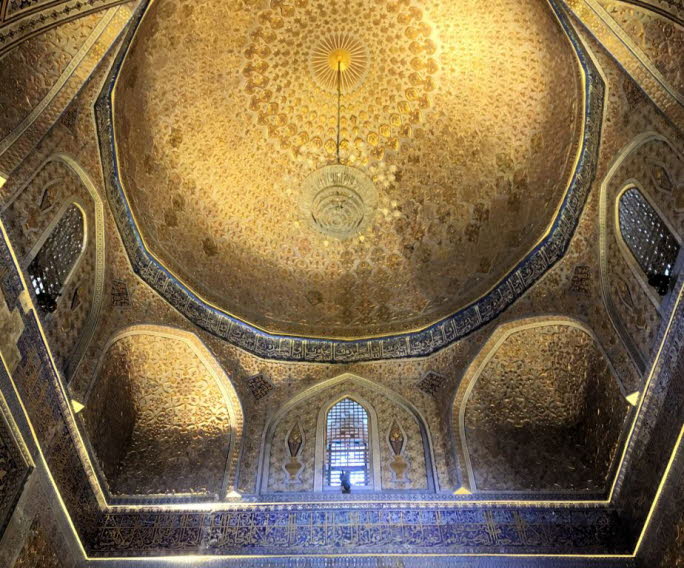 Timur errichtete dieses berühmte Denkmal als Ruhestätte seines Enkels und mutmaßlichen Erben Muhammad Sultan, der 1403 im Alter von 29 Jahren in der Schlacht starb. 1405 wurde Timur selbst hier beigesetzt, und später auch seine Söhne Miranshah und Shah Rukh und Enkel Pir Muhammad. Timurs spiritueller Berater, Sayyid Barakah, liegt ebenfalls darin. Ulugh Beg, der das Grab als Mausoleum der timuridischen Dynastie errichtet und Erweiterungen in Auftrag gegeben hatte, war der letzte der Familie, der in der Krypta untergebracht wurde. Das Mausoleum wurde auf der Südseite eines ummauerten quadratischen Innenhofs errichtet, der bereits auf zwei Seiten von einer nicht mehr erhaltenen Madrasa und Khanaqa begrenzt wurde. Minarette markierten jede Ecke des Hofes, von denen zwei teilweise erhalten sind. Der Grundriss des Mausoleums bildet außen ein modifiziertes Achteck: Ein vorspringendes Eingangsportal verlängert die Nordseite des Achtecks und nimmt an den beiden flankierenden Seiten an Länge ab. Eine bauchige, gerippte Kuppel auf einer engen, hohen Trommel präsentiert ein monumentales Profil, das über die ganze Stadt hinweg sichtbar ist. Der Innenraum umfasst eine quadratische Kammer, einen Erker an jeder Wand, eine Treppe in der südöstlichen Ecke, die zur kreuzförmigen Krypta führt, eine achteckige Übergangszone und eine ungewöhnlich steile halbkugelförmige Kuppel. Zwischen den beiden Kuppelschalen sind mit Holz verbundene vertikale Flansche verborgen, die von der inneren Kuppel getragen werden und der äußeren Kuppel Struktur verleihen. Eine unsichtbare „Säule“, die auf dem Mittelpunkt der inneren Kuppel errichtet ist, endet in abgewinkelten Holzzinken, die auch die äußere Kuppel tragen. Im Jahr 1424 fügte Ulugh Beg einen Korridor hinzu, der als seine „Galerie“ bekannt war und durch die östliche Bucht des Mausoleums zugänglich war. Vier gewölbte Joche bilden den Korridor, der zu einem kleinen Vestibül führt, das vom Innenhof aus zugänglich ist. Im 17. Jahrhundert wurde mit dem Bau eines Iwan an der Westseite des Mausoleums begonnen, der jedoch unvollendet blieb. Das außergewöhnliche Innendekorationskonzept nutzt luxuriöse Materialien und eine Fülle von Techniken. Onyx-Sechsecke bilden einen Dado, der von einem flachen Gesims aus Marmor-Muqarnas gekrönt wird. Darüber umgibt ein auf Jaspis gemaltes goldenes Inschriftenband das Mausoleum. Als eines der frühesten Beispiele dieser Technik wurde Pappmaché häufig verwendet. Die Innenkuppel, die Übergangszone und die Muqarnas-Gewölbe der vier Buchten wurden alle mit bemaltem Formpapier verziert. Andere Bereiche wurden verputzt und gestrichen oder mit einer Verkleidung aus verschiedenen Materialien bedeckt. Die Außendekoration besteht aus umfangreichem Hazara-Mauerwerk. Die Kuppel ist in zwei Blautönen gefliest. Bänder aus Kachelinschriften umgeben die Trommel; Eine monumentale kufische Inschrift aus weißen und schwarzen Kacheln wiederholt „Gott ist ewig“.