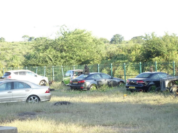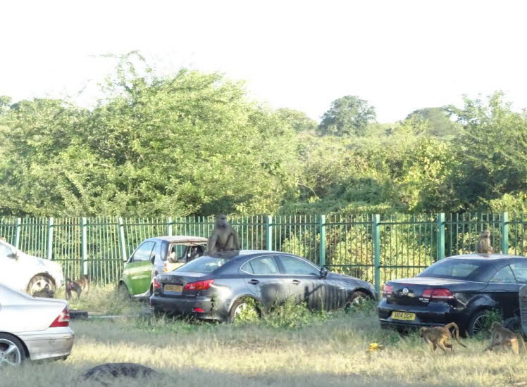 Die Visa-Gebühr für die Einreise liegt bei 30 US$. Wir mussten 50 Dollar bezahlen, die wir auch noch nach Sambia weitrerreisen wollten. Zimbabwe und Sambia waren einmal ein Staat: Rodesien…Es ist ratsam, diesen Betrag passend dabei zu haben. 50er Scheine sind für die Zahlung noch akzeptabel, aber bei 100ern könnte es sein, dass man etwas länger auf das Wechselgeld warten muss. Es werden jetzt auch Euro und Südafrikanische Rand akzeptiert. Die Umtauschkurse sind jedoch sehr ungünstig, und nur ein zweiter Schalter akzeptiert diese „Fremdwährungen“. Bei Reisen mit Kindern unter 18 Jahren sollte stets eine beglaubigte Kopie der Geburtsurkunde mitgeführt werden. Fehlt einer der leiblichen Elternteile, ist zusätzlich eine beglaubigte Ermächtigung des abwesenden Elternteils erforderlich. … Beim Grenzübertritt von Namibia nach Botswana werden diese Unterlagen verlangt. Unser Reisepass ist nach dieser Reise voller Stempel…Der Grenzübergang auf der Seite Zimbabwes hat inzwischen den Charme eines Schrottplatzes, auf dem die Affen auf verrottenden Fahrzeugen, den Papiere fehlten, herumtoben und Warzenschweine nach Essbarem suchen (siehe die folgenden Fotos). Doch man verdrängt das und so kann es weiter gehen zu den Victoria Wasserfällen und man wird durch dieses einmalige Naturschauspiel für die vorherigen Unannehmlichkeiten mehr als entschädigt.