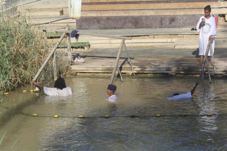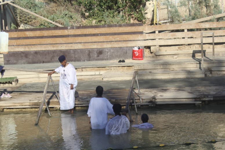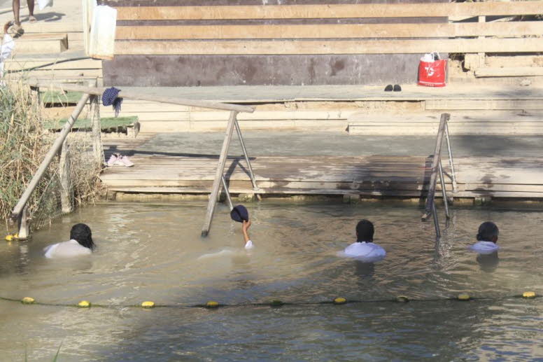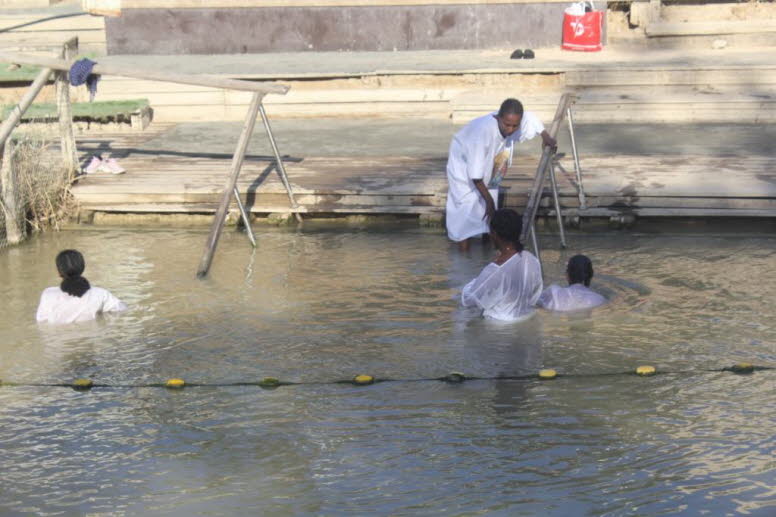 Das Bild zeigt die Taufstelle Yardenit am Jordan in Israel. Es ist ein bedeutender Pilgerort für Christen. Die Stätte liegt am südlichen Ende des See Genezareth. Gläubige Pilger nutzen den Ort für Taufen oder zur Erneuerung ihrer Taufgelübde. Der Jordan fließt in einer tektonischen Senke und hat eine der niedrigsten Höhenlagen der Welt. Am diesseitigen Ufer, in Jordanien, befindet sich eine weitere als Weltkulturerbe anerkannte Taufstelle namens Al-Maghtas.