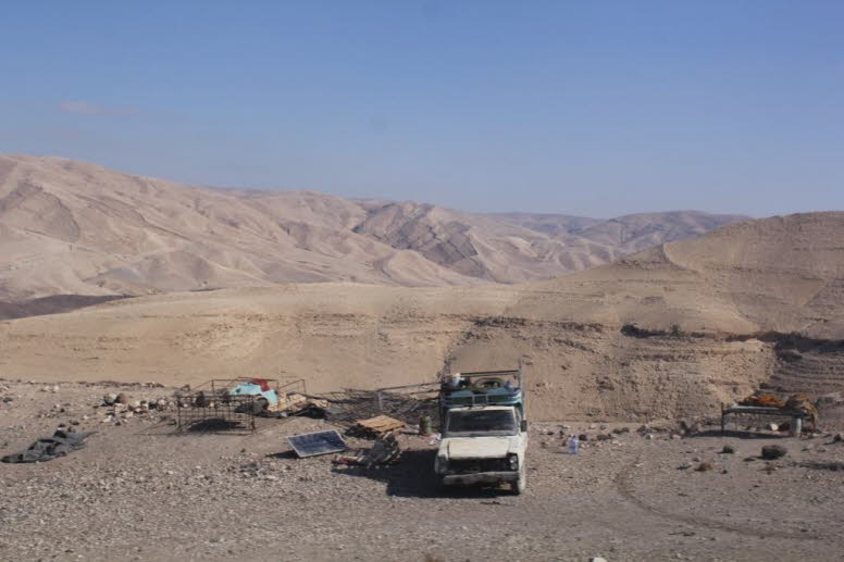 Das Bild zeigt ein Zelt in einer trockenen, hügeligen Wüstenlandschaft, das typischerweise als Unterkunft für Beduinen dient. Diese Art von Zelt ist eine temporäre Struktur, die an die extremen Witterungsbedingungen der Wüste angepasst ist. Die Materialien schützen sowohl vor intensiver Sonne als auch vor Wind und Sand.
