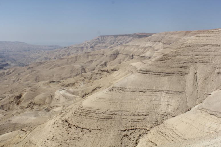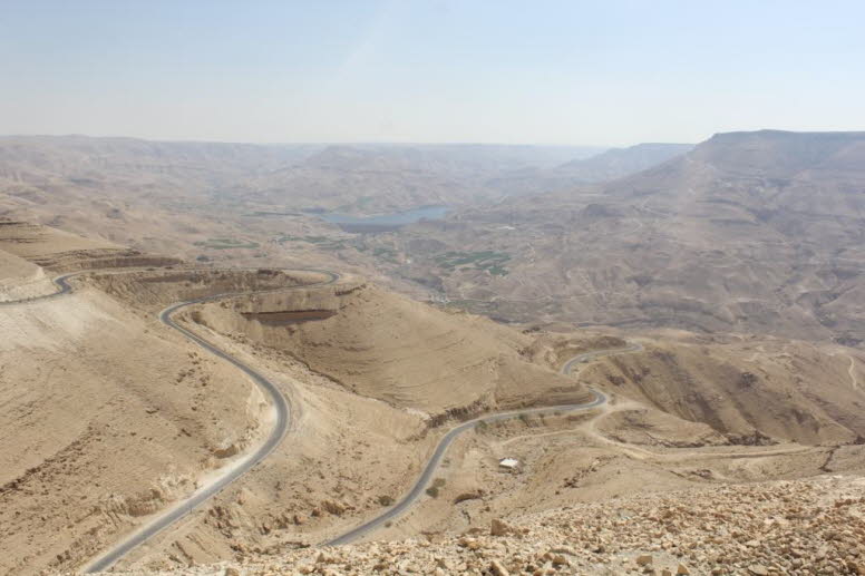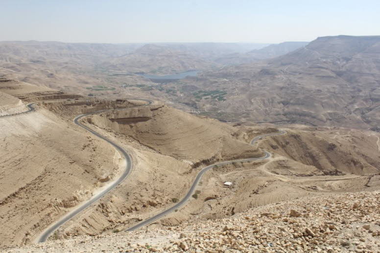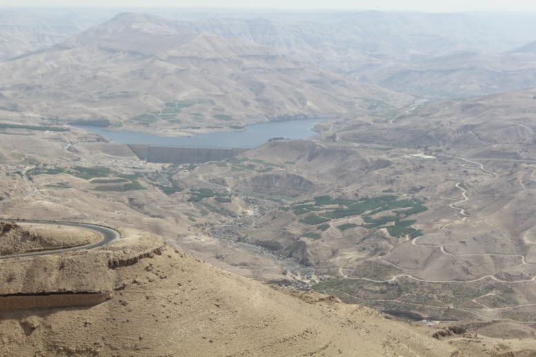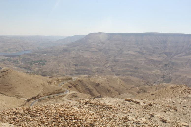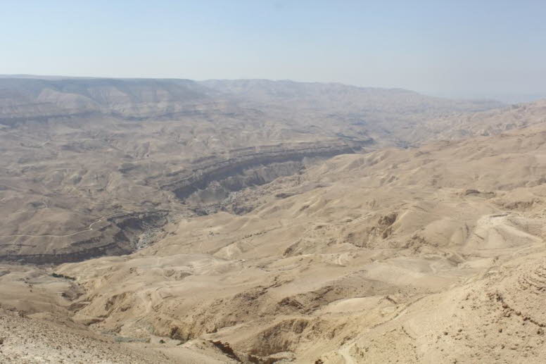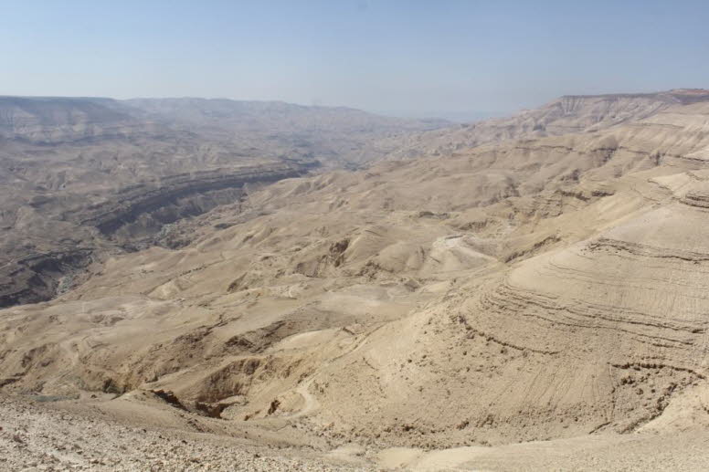 Das Bild zeigt die dramatische Landschaft des Wadi Mujib in Jordanien, auch bekannt als der „Grand Canyon Jordaniens“. Es ist das am tiefsten gelegene Naturschutzgebiet der Welt. Das Wadi Mujib ist ein Trockental im Bergland Jordaniens, das 90 km südlich von Amman liegt und in das Tote Meer mündet. Die Schlucht erreicht an manchen Stellen Höhen von 900 Metern über dem Meeresspiegel, während sie am Toten Meer 410 Meter unter dem Meeresspiegel liegt. Der biblische Fluss Arnon fließt durch das Tal, sofern er oberhalb der Mujib-Talsperre nicht trockenfällt. Die Gegend ist bekannt für ihre biologische Vielfalt mit über 300 Pflanzenarten und 10 Raubtierarten, darunter der seltene Gemeine Steinbock.