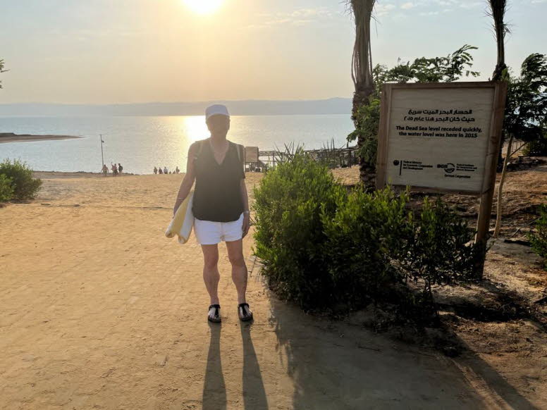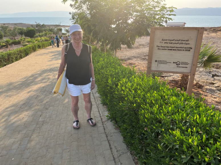 Die abgebildete Szene zeigt einen Moment am Ufer des Toten Meeres, dem tiefstgelegenen Punkt der Erde. Ein Schild weist darauf hin, dass der Wasserspiegel des Sees im Jahr 1995 an dieser Stelle war, was den rapiden Rückgang des Wasserspiegels verdeutlicht. Sein Wasserspiegel sinkt jährlich um etwa einen Meter, hauptsächlich aufgrund der Umleitung des Jordanwassers für landwirtschaftliche Zwecke.