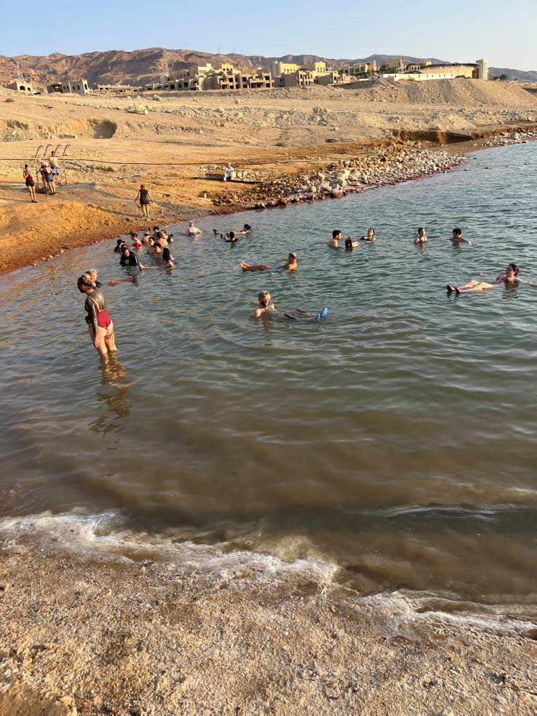 Das Bild zeigt das Tote Meer, einen Salzsee im Nahen Osten. Es ist der tiefste Punkt der Erde, gelegen etwa 430 Meter unter dem Meeresspiegel. Der See grenzt an Jordanien, Israel und das Westjordanland. Sein Salzgehalt ist extrem hoch, etwa zehnmal salziger als der Ozean, weshalb man mühelos an der Oberfläche schwimmen kann. Aufgrund des hohen Salzgehalts gibt es keine Fische oder Pflanzen im See, was ihm seinen Namen gab.