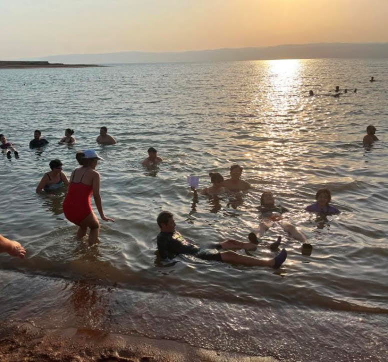 Die Szene zeigt einen Sonnenuntergang über dem Toten Meer